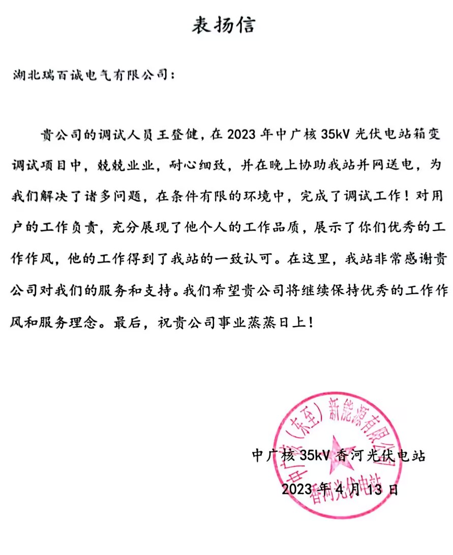 貴公司的調(diào)試人員王登健,在2023年中廣核35kV光伏電站箱變調(diào)試項(xiàng)目中,兢兢業(yè)業(yè),耐心細(xì)致,并在晚上協(xié)助我站并網(wǎng)送電,為我們解決了諸多問(wèn)題,在條件有限的環(huán)境中,完成了調(diào)試工作!對(duì)用戶的工作負(fù)責(zé),充分展現(xiàn)了他個(gè)人的工作品質(zhì),展示了你們優(yōu)秀的工作作風(fēng),他的工作得到了我站的一致認(rèn)可。在這里,我站非常感謝貴公司對(duì)我們的服務(wù)和支持。我們希望貴公司將繼續(xù)保持優(yōu)秀的工作作風(fēng)和服務(wù)理念。最后,祝貴公司事業(yè)蒸蒸日上!